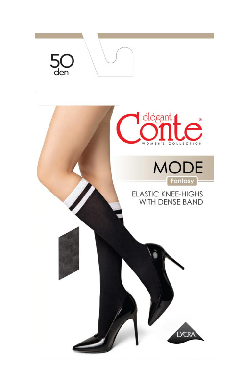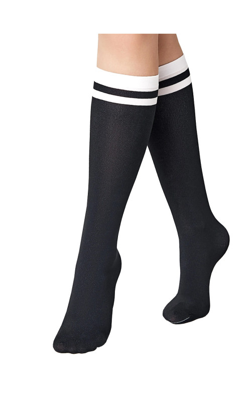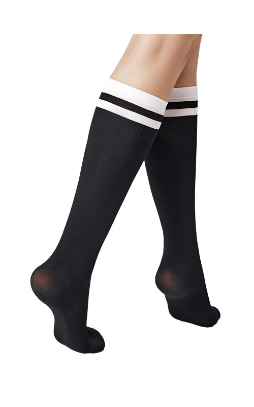 Эластичные плотные гольфы CONTE MODE 50 в черном цвете, с отделкой контрастными белыми полосками. Изготовленные из микроволокна (микрофибра) с равномерной ровной вязкой, благодаря 3D технологии. Гольфы непрозрачные, с мягким бархатистым эффектом, комфортной резинкой, позволяющей удержание без передавливания, не формованные, с прозрачным укрепленным мыском.