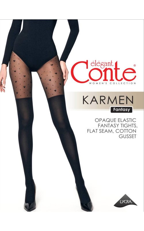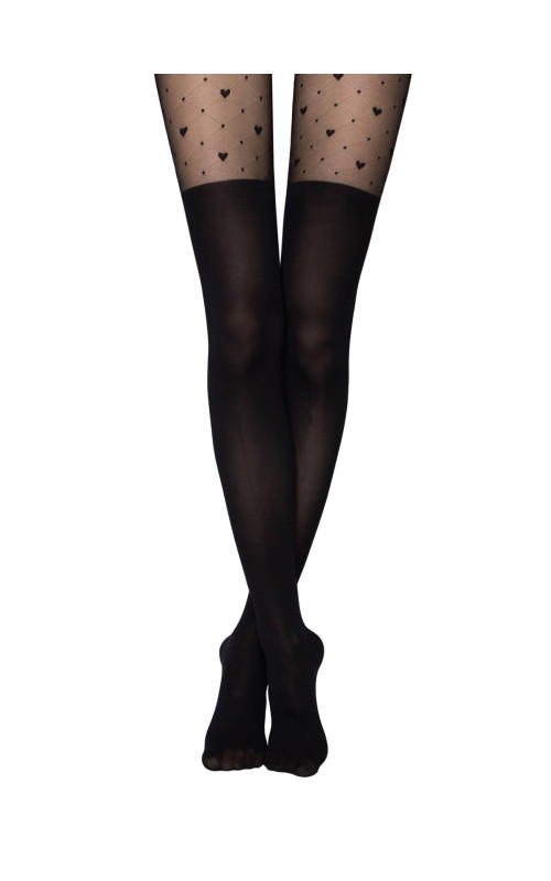 Эластичные плотные элегантные колготки из микроволокна (microfibra), плотные в области чулка и прозрачные в верхней части - имитируют ботфорты. Верхняя часть украшена мелким рисунком в виде сеточки из ромбов и сердечек. Колготки с гигиенической ластовицей из хлопка, с комфортным плоским круглым соединительным швом, не формованные.