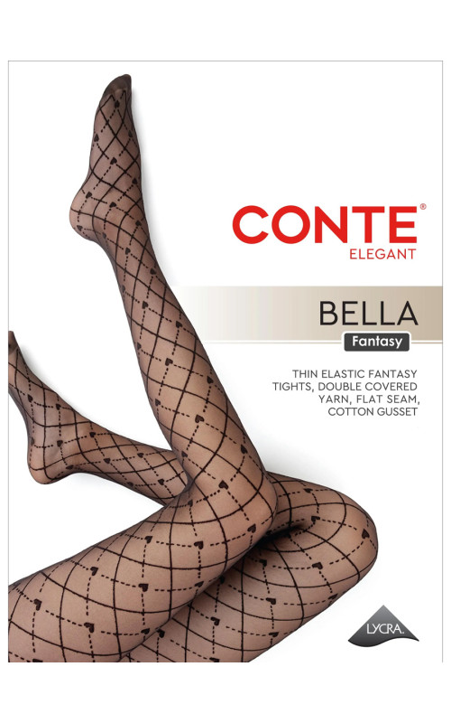 Эластичные тонкие элегантные колготки CONTE BELLA 20 с рисунком в виде пересекающихся диагональных линий, образующих ромбы и маленьких сердечек. Помогут подчеркнуть вашу индивидуальность, сделать ваш образ более заметным и придать ему определенную изюминку. Прозрачные, с гладким шелковистым эффектом. Колготки с классической посадкой, однородные по всей длине, с гигиенической ластовицей из хлопка, с комфортным плоским соединительным швом, не формованные, с прозрачным укрепленным мыском.