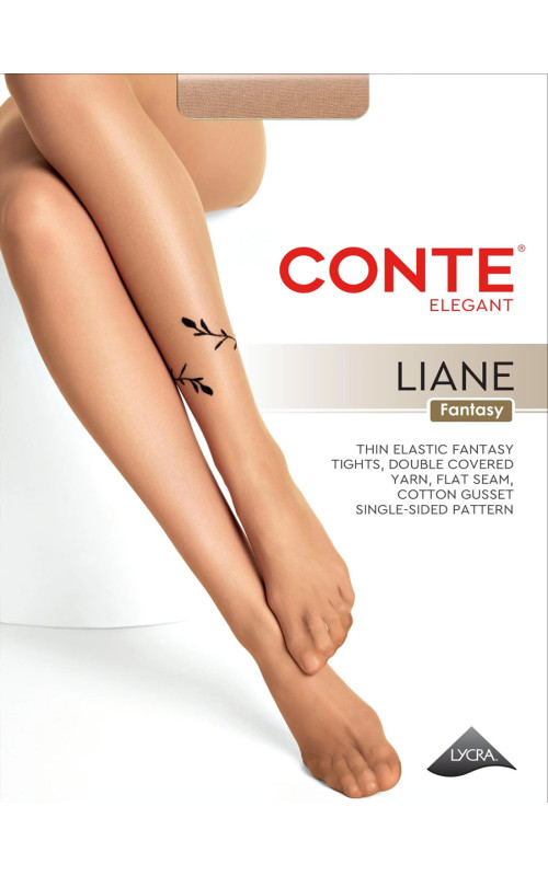 Эластичные тонкие элегантные колготки с контрастным рисунком в виде тату на голени в виде двух веточек лианы CONTE LIANE 20. Прозрачные, с гладким шелковистым эффектом. Рисунок выполнен термоаппликацией из флокированной ткани. Колготки с классической посадкой, с верхней частью в виде шортиков,с гигиенической ластовицей из хлопка, с комфортным плоским соединительным швом, не формованные, с прозрачным укрепленным мыском.
