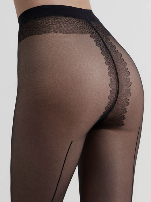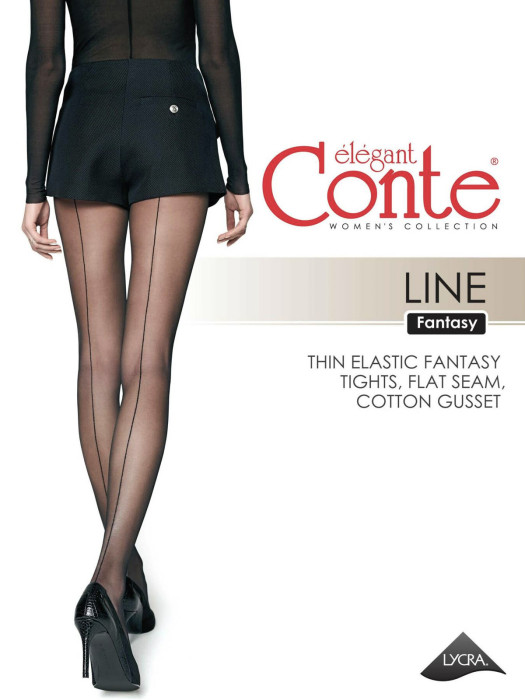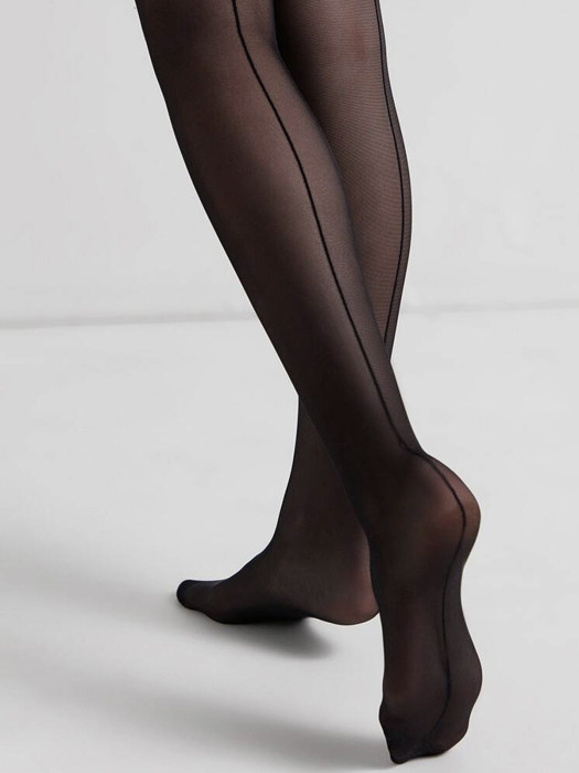 Эластичные тонкие элегантные колготки с имитацией шва сзади по ноге, прозрачные, с гладким шелковистым эффектом. Колготки с классической посадкой, однородные по всей длине, гигиенической ластовицей из хлопка, с комфортным плоским соединительным швом, не формованные, с прозрачным укрепленным мыском.