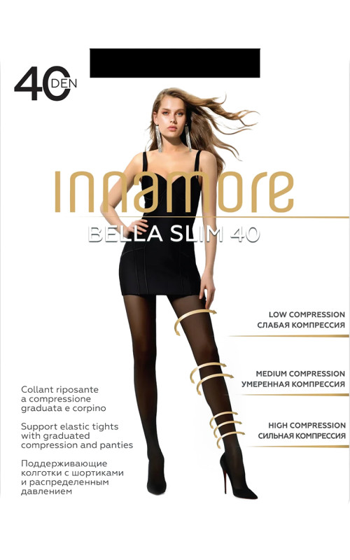 Эластичные средние по плотности колготки INNAMORE Bella Slim 40 на каждый день с легким поддерживающим эффектом по ноге, с гладким шелковистым эффектом. Колготки с классической посадкой, верхней частью в виде шортиков, без ластовицы, с простым круглым соединительным швом, не формованные, с прозрачным укрепленным мыском.