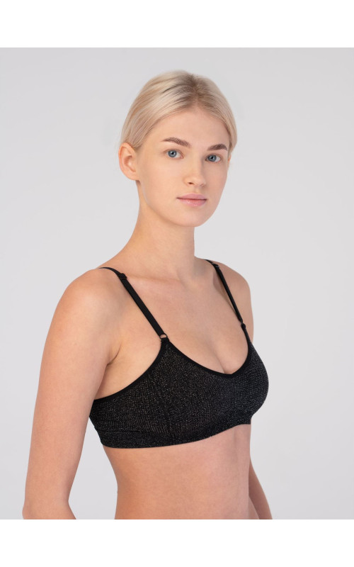 Комфортный топ с чашечками из микрофибры в рубчик на тонких регулируемых бретелях. Мягкие треугольные чашки обеспечивают легкую поддержку, использование люрексовой нити придает изделию оригинальность.