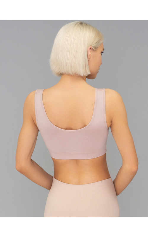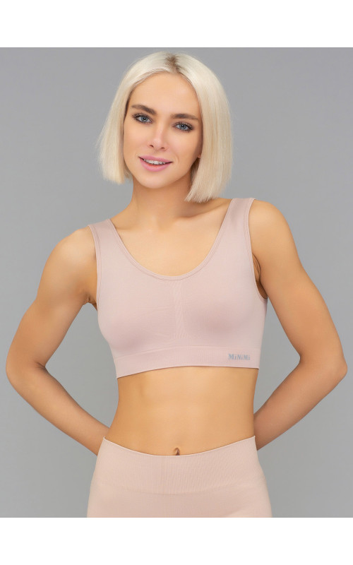 Бесшовный топ на широких бретелях, выполненный из мягкой эластичной микрофибры. Фронтальная часть модели декорирована надписью "Minimi".