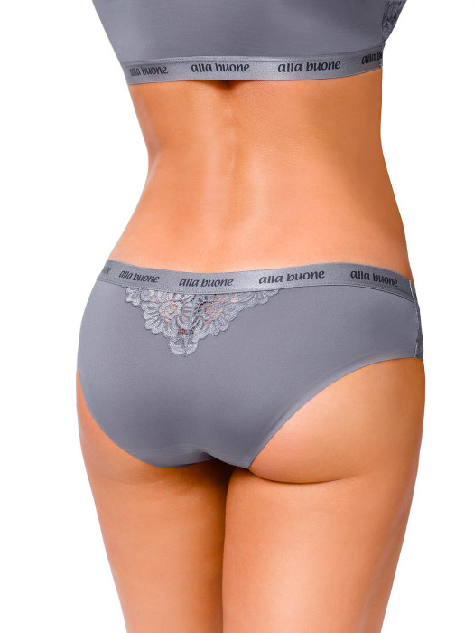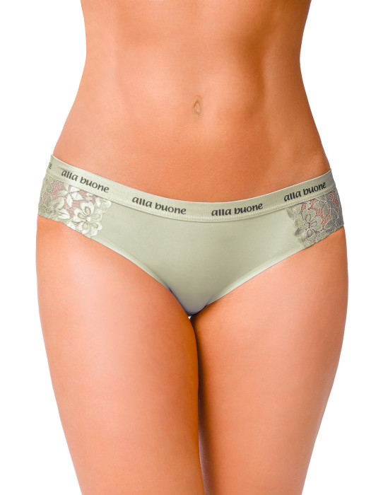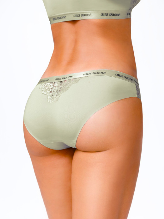 Женские трусики-слипы с низкой посадкой на бедрах, с тонким незаметным краем, выполненный методом горячей проклейки. Гладкие спереди и сзади, кружевными вставками сбоку и небольшой кружевной вставкой сзади. Пояс-резинка с логотипами Alla Buone".