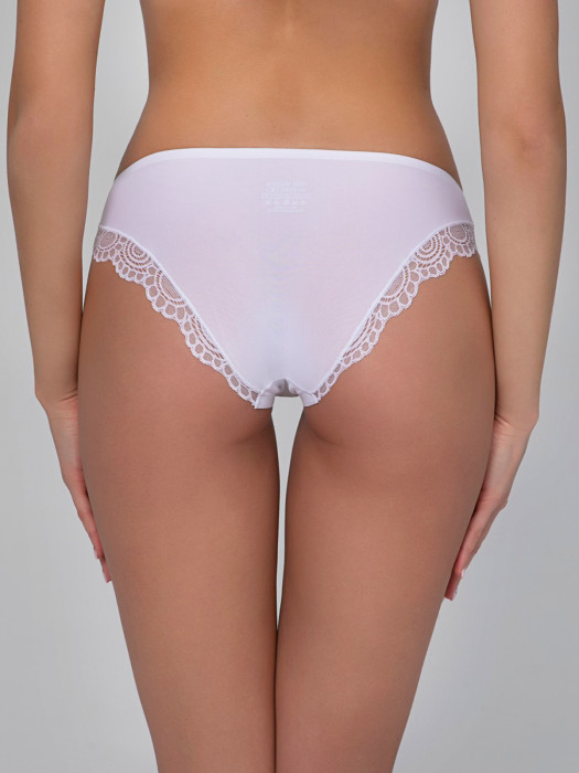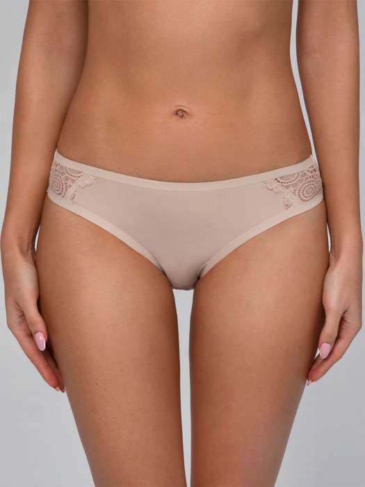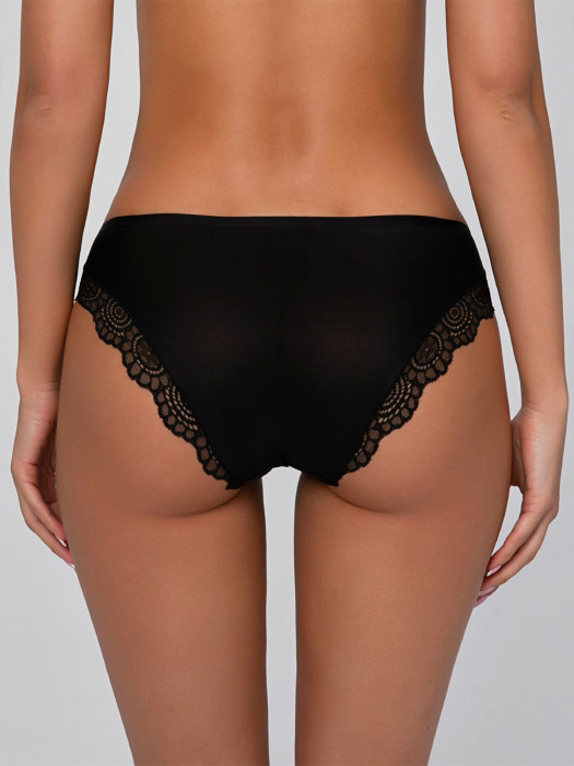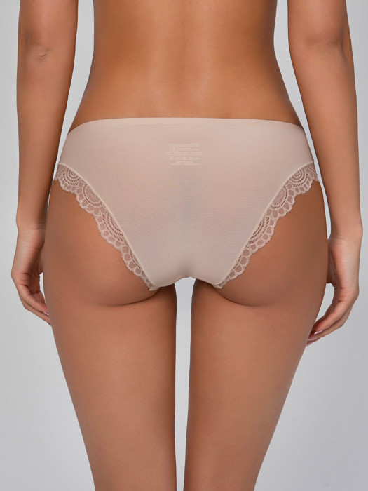 Женские трусики-слипы с узкой боковой частью, с низкой посадкой на бедрах, с тонким незаметным краем, выполненный методом горячей проклейки. Гладкие спереди и сзади и кружевными вставками сбоку и небольшой кружевной вставкой сзади.