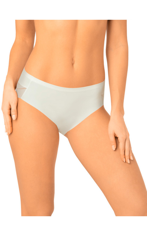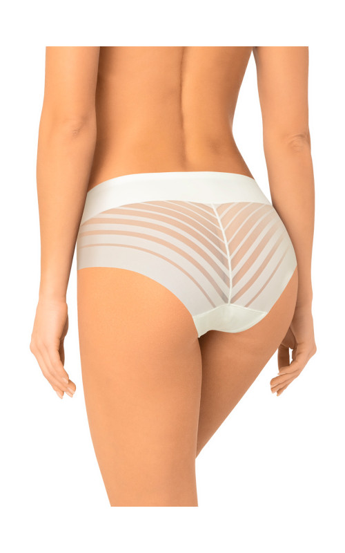 Трусы макси-слип с высокой линией талии. Передняя деталь выполнена из мягкой микрофибры, задняя деталь - из декоративного полотна с чередующимися полосками разной ширины. Спереди вырез ножки обработан с использованием технологии "лазерный край". Линия талии проклеена вподгибку. Хлопковая ластовица притачана к изделию потайным швом. Благодаря особенностям обработки материалов изделие абсолютно незаметно под одеждой.