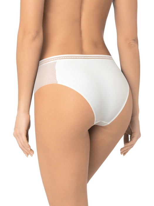 Трусы макси-слип AMORET MESH MS5040 молочного цвета со средней линией талии, слегка открывают область ягодиц. Передняя и задняя детали выполнены из микрофибры, боковые вставки из кружева с сетчатой структурой. Широкая декоративная резинка, использованная для обработки талии, придает изделию ультрамодное звучание. Хлопковая ластовица.