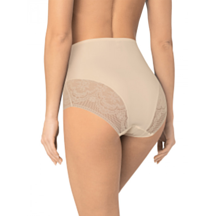 Трусы-слипы AMORET PURE HW5029 бежевого цвета с высокой линией талии. Выполнены из деликатного эластичного полотна. Вырез ножки декорирован плоским кружевом с цветочным рисунком. По талии пришита эластичная тесьма. Хлопковая ластовица. Благодаря особенностям кроя изделие абсолютно незаметно под одеждой, при этом трусы обладают легким корректирующим эффектом.