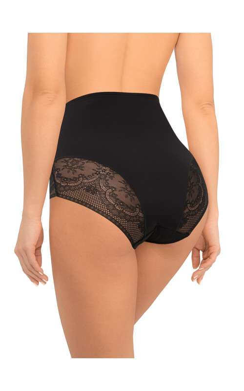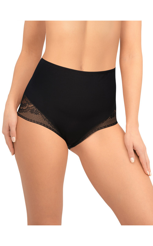 Трусы слипы AMORET PURE HW5029 черного цвета с высокой линией талии. Выполнены из деликатного эластичного полотна. Вырез ножки декорирован плоским кружевом с цветочным рисунком. По талии пришита эластичная тесьма. Хлопковая ластовица. Благодаря особенностям кроя изделие абсолютно незаметно под одеждой, при этом трусы обладают легким корректирующим эффектом.