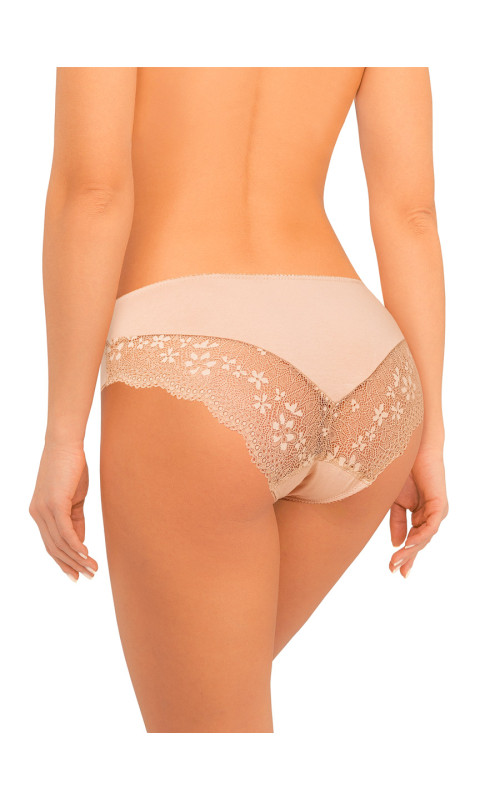 Трусы слипы со средней линией талии AMORET COTTON S1039 бежевого цвета, выполнены из хлопкового полотна с содержанием эластана. Задняя деталь из мягкого кружева с цветочным рисунком. Линия талии и вырезы ножек обработаны эластичной тесьмой с деликатным фестончатым краем. Хлопковая ластовица.