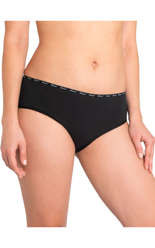 Трусы-слипы со средней линией талии, с широким бочком, выполнены из однотонного хлопкового плотна. Для обработки талии использована узкая декоративная резинка с контрастным логотипом. Хлопковая ластовица.