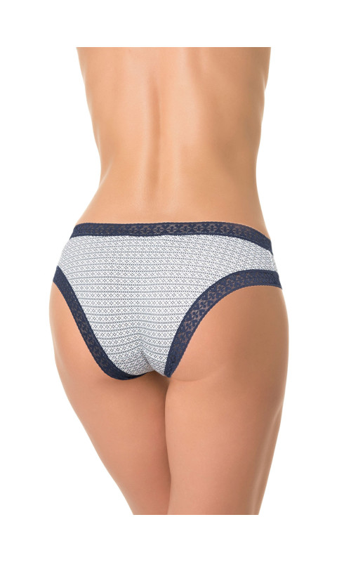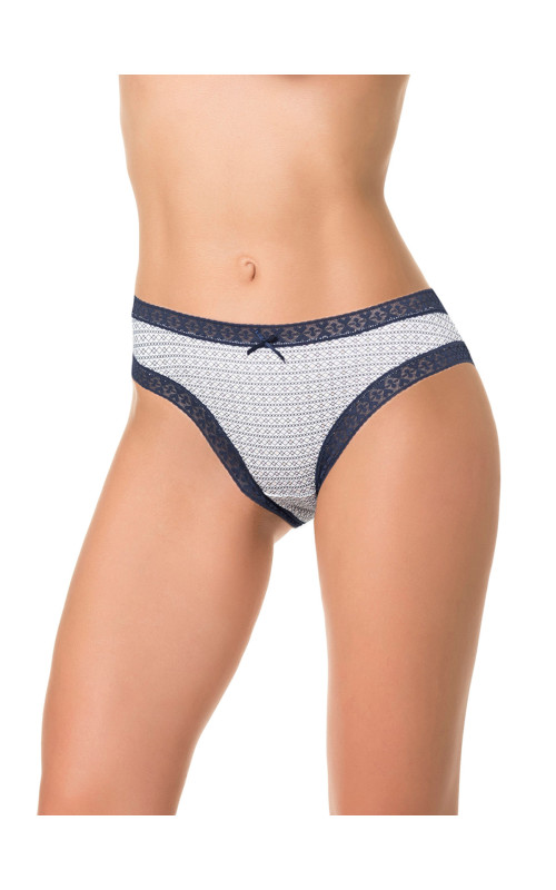 Трусы со средней линией талии, выполнены из деликатного принтованного хлопка со спандексом. Геометрический принт. Вырез ножки и талия отделаны контрастной широкой кружевной резинкой. Декор - атласный бантик. Хлопковая ластовица.