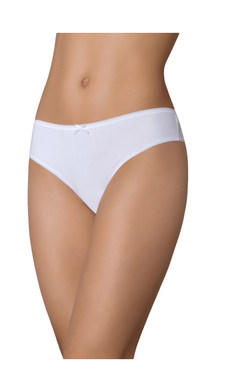 Стринги из хлопка, края отделаны ажурной тесьмой, спереди маленький бантик, задняя часть кружевная.