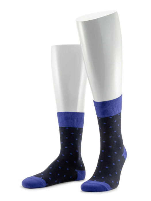 Оригинальные мужские носки с рисунком горох, с контрастного по цвету резинкой, носком и пяткой, из гребенного хлопка, с добавлением полиамида и эластана, для повышения износоустойчивости. Сочетание оригинального внешнего вида с хорошими гигиеническими свойствами натурального хлопка.