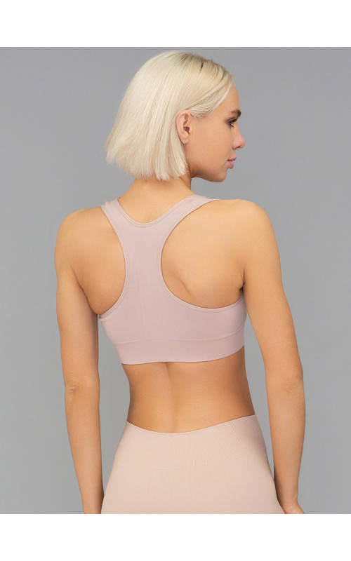 Бесшовный спортивный топ со вкладышами, широкими бретелями и спинкой-борцовкой, выполненный из мягкой эластичной микрофибры. Фронтальная часть модели декорирована надписью "Minimi".