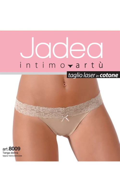 Трусы-танга из хлопка с эластаном, на поясе широкая кружевная резинка с фронтальной аппликацией в виде банта, заниженная талия, лазерная обработка края.